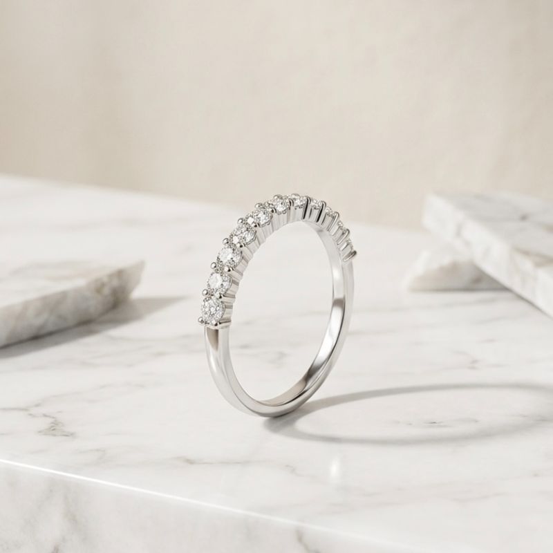 Anel Meia Aliança Prata 925 Cravejada em Moissanite - Banho de Ródio